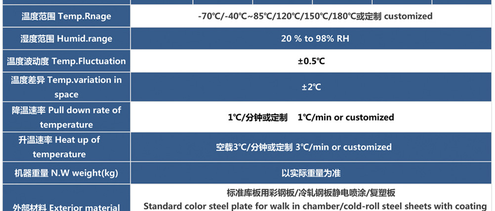 用途:步入式恒溫恒濕試驗室可為汽車、大型部件、大尺寸半成品和成品模擬特定的環境條件。如樣品評估、研發測試生產測試,加速壓力測試,可靠性測試,故障分析,以及其他需要環境模